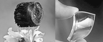 中國(guó)儲(chǔ)能網(wǎng)訊:左圖為由石墨烯和碳納米管制成的超輕材料。右圖為石墨烯在柔性電子上的應(yīng)用。