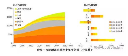 世界一次能源需求在2050年達(dá)到175億噸油當(dāng)量,增長約27%,期間年均增長0.65%; 2016~2030年為0.95%,2031~2050年為0.45%,增速逐漸放緩。展望期內(nèi)可再生能源年均增長6%,天然氣年均增長1.3%,石油年均增長0.3%,煤炭年均下降0.8%。