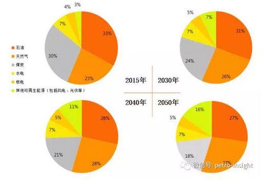 可再生能源占一次能源需求增量近一半。2050年,煤炭需求較2015年減少8.2億噸油當(dāng)量,石油需求增加4.4億噸油當(dāng)量,天然氣需求增加15.2億噸油當(dāng)量,可再生能源需求增加22.5億噸油當(dāng)量。