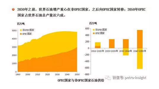3.世界石油需求增速逐步放緩,2050年達(dá)到48.2億噸,需求增量全部來自非OECD國家;OPEC國家是展望后半期供應(yīng)增量的主要提供者。