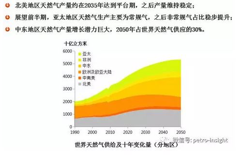 2030年后,歐洲及歐亞大陸天然氣需求有小幅下降,緣于可再生能源的快速發(fā)展;其他地區(qū)天然氣需求均保持快速增長。中東和亞太是未來全球天然氣產(chǎn)量主要增長來源。