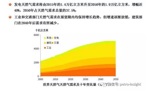 4.天然氣需求在展望期內(nèi)穩(wěn)步增長,且2040年前為高速增長期,需求增長主要在電力、工業(yè)和居民等部門。