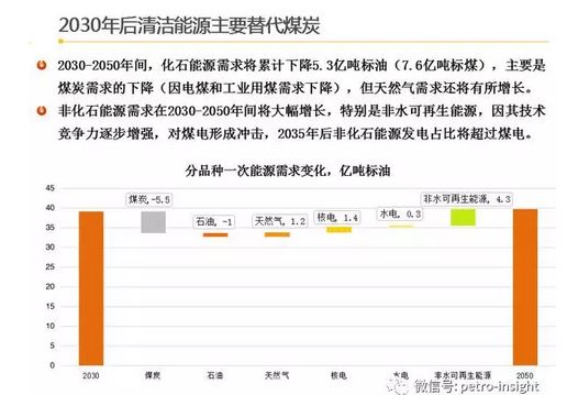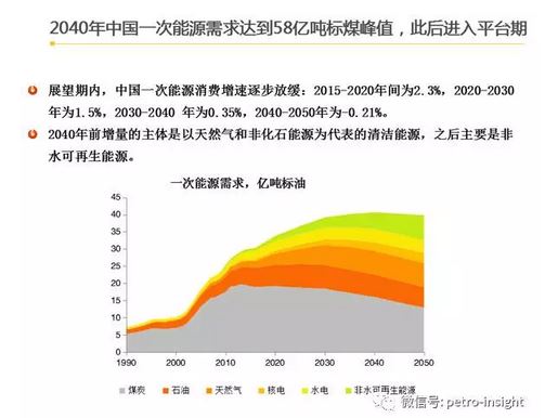 1.一次能源需求將于2040年前后達(dá)到58億噸標(biāo)煤(40.6億噸標(biāo)油)的峰值水平,而化石能源需求則將于2030年達(dá)峰。相應(yīng)地,能源相關(guān)CO2排放也在2030年達(dá)峰。