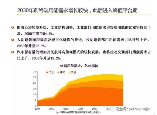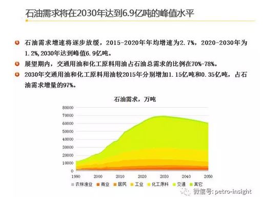 3.石油將在2030年達(dá)到峰值需求6.9億噸。交通用油也在2030年達(dá)到3.8億噸的峰值水平;其中,柴油需求逐步下滑,汽油需求在2025年前后達(dá)峰,航煤需求將保持增長。