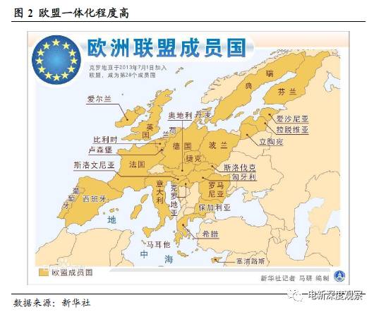 歐洲地區(qū)一體化程度較高。政治上,歐盟包含了德國、法國、意大利等28個國家,主要大國都已加入聯(lián)盟。經(jīng)濟上,歐元區(qū)包含歐盟19個成員及其他幾個使用歐元作為官方貨幣的國家。此外,歐洲電網(wǎng)發(fā)展早,配電網(wǎng)運營商聯(lián)盟、輸電網(wǎng)運營商聯(lián)盟、風(fēng)力協(xié)會等組織發(fā)展成熟,成員覆蓋全歐,具有建立國際互聯(lián)電網(wǎng)的基礎(chǔ)和需求。
