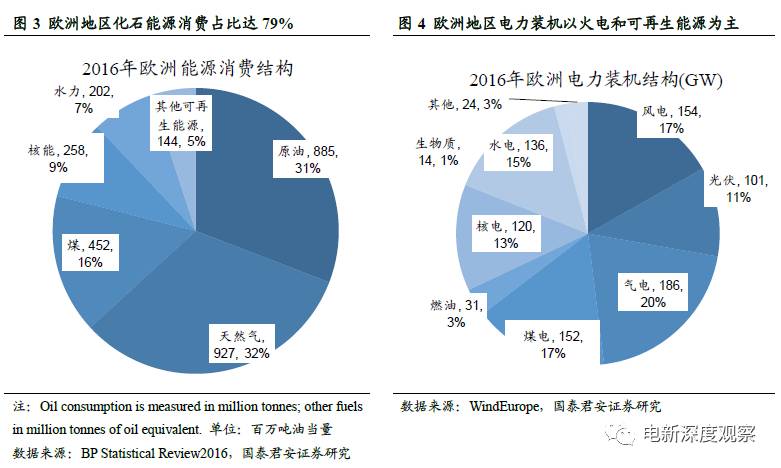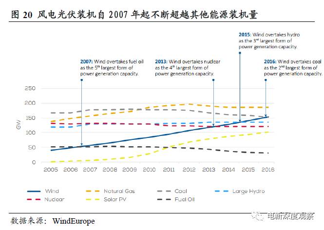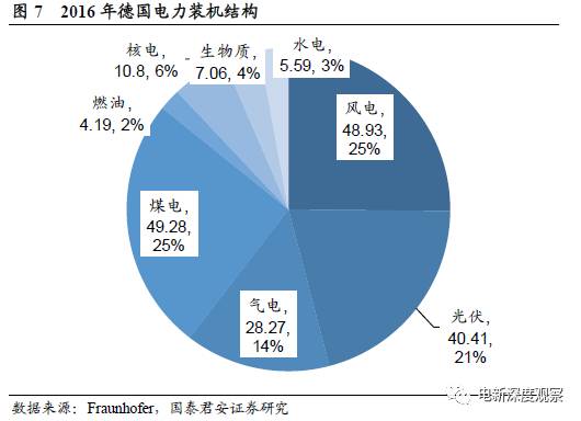 風(fēng)電光伏裝機比例上升。歐洲目前風(fēng)力發(fā)電總裝機已經(jīng)取代煤炭成為第二大歐洲電力裝機結(jié)構(gòu)主體,首位為天然氣能源裝機。2016年德國占風(fēng)力發(fā)電總裝機量的25%,與煤電裝機比例持平。