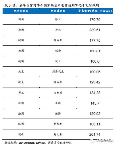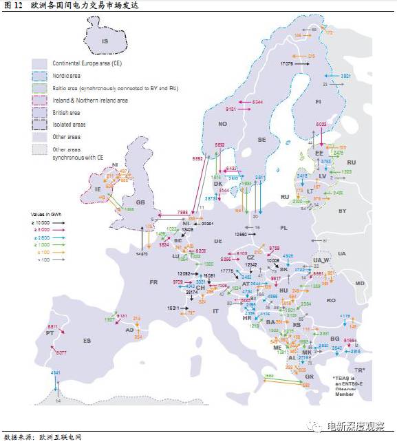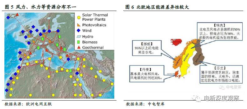 歐洲各地區(qū)間能源差異性大。歐洲各地區(qū)間能源結(jié)構(gòu)具有一定的差異性,如風(fēng)力資源主要分布于北海東西海岸及愛爾蘭地區(qū),水力資源主要分布于北歐地區(qū),太陽能資源主要分布于地中海沿岸地區(qū)等等。各地區(qū)能源資源的差異也導(dǎo)致了電力裝機、發(fā)電能力的差異,巨大的差異性導(dǎo)致了國家間電力交易的需求??鐕旊娋€路和國際電力交易市場應(yīng)運而生。