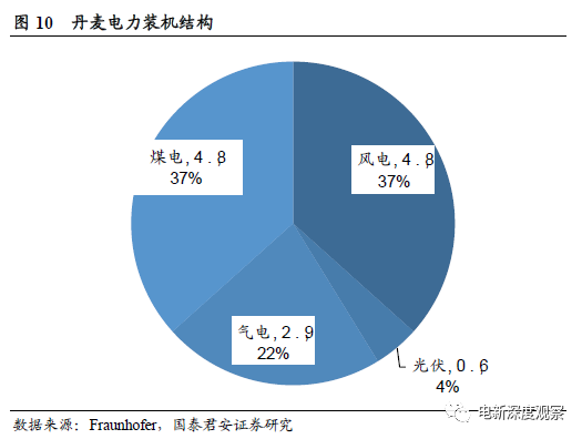 丹麥?zhǔn)秋L(fēng)電光伏大國,煤電與氣電也豐富,故電網(wǎng)調(diào)節(jié)能力較強。①丹麥沒有核電機組,常規(guī)水電與抽水蓄能電站裝機容量也幾乎為零,但其風(fēng)電與光伏的發(fā)展居于世界領(lǐng)先地位,是僅有的新能源裝機超過35%的國家。丹麥風(fēng)電裝機容量4845MW,光伏裝機容量601MW,煤電裝機容量為4847MW,氣電機組裝機容量為2941MW。丹麥電網(wǎng)位于歐洲大陸的北部,南鄰德國電網(wǎng),北靠北歐電網(wǎng)。②丹麥電網(wǎng)與周圍電網(wǎng)的互聯(lián)傳輸能力,受入容量可以達到5820兆瓦,與鄰國電網(wǎng)互聯(lián)的容量已經(jīng)超出了本國的最大負荷,加上丹麥電網(wǎng)內(nèi)部2941兆瓦的氣電容量以及4847兆瓦的煤電容量,丹麥電網(wǎng)調(diào)節(jié)能力優(yōu)異,這也是丹麥電網(wǎng)在一段時期風(fēng)電機組所發(fā)電量超出區(qū)內(nèi)最大負荷運行的一個重要條件和原因。