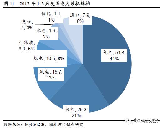 英國作為工業(yè)革命起源的老牌發(fā)達國家,能源裝機結(jié)構(gòu)改善明顯。2014年,英國化石能源發(fā)電約占電力供應(yīng)總量的58.7%,其次是可再生能源發(fā)電,占比達到18.1%;核電占比17.1%;據(jù)MyGridGB,2017年1-5月英國電力供應(yīng)中有51.4TWh來自天然氣發(fā)電,占總量的40.9%,其次是核電(26.3TWh,20.9%)、風(fēng)電(15.7TWh,12.6%)、煤電(10.5TWh,8.3%)、生物質(zhì)發(fā)電(6.9TWh,5.5%)、太陽能(4.0TWh,3.2%)、水電(1.9TWh,1.5%)、儲能(1.1TWh,0.9%);此外還有7.9TWh來自進口,占電力供應(yīng)的6.3%,化石能源發(fā)電裝機已大大降低。