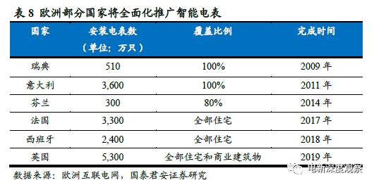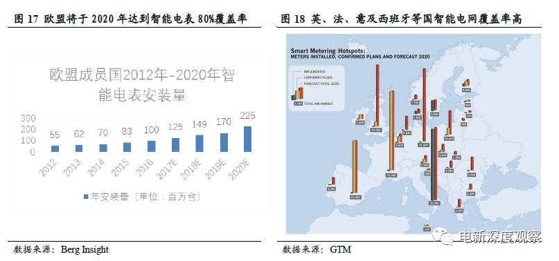智能電表處于推廣階段,少數(shù)歐盟成員國已經(jīng)覆蓋全國。隨著歐盟委員會提出2020年歐洲家庭的智能電表覆蓋率達到80%的規(guī)劃后,歐洲正式踏入智能電網(wǎng)改造階段。在智能電表方面,歐盟總計有2.81億客戶量,有望在2020年超越亞洲成為全球第一大市場,在預(yù)計期間增加1億電表安裝量,覆蓋客戶達到2.25億。