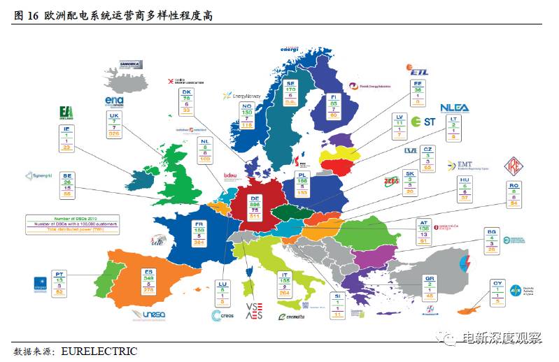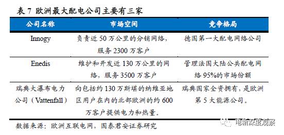 歐洲配網(wǎng)運營市場集中度高。歐洲有190家配電公司擁有超過10萬家客戶,約占總體配電行業(yè)的7.6%,市場集中度較高。其中最大的配電運營商公司包括德國的Innogy,法國的Enedis和瑞典的Vattenfall。