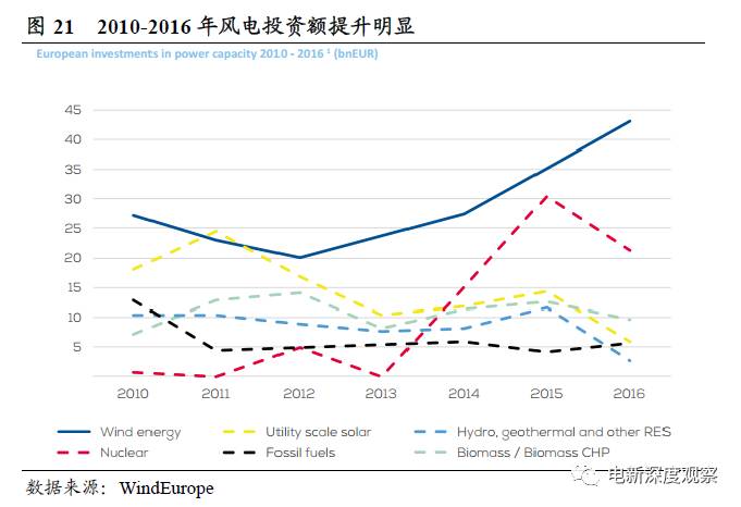 歐洲風(fēng)力裝機投資持續(xù)攀升。2016年,歐洲市場新增430億歐元投資,投放于新的風(fēng)電場建設(shè)、再融資操作、項目收購和公開市場籌資,同比上漲22%。投資額大部分用于海上風(fēng)力發(fā)電廠的建設(shè)。
