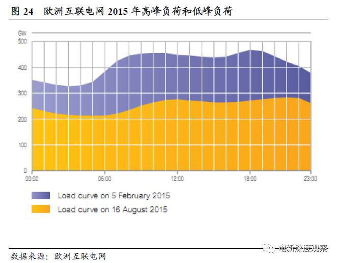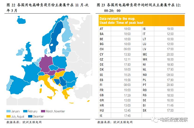 歐洲峰谷電價套利市場巨大。歐洲互聯(lián)電網(wǎng)的高峰負荷時間為2月5日,峰值為528Gw。最低負荷時間為8月16日,谷值為240Gw。各國間高峰負荷月份主要集中在11月至次年3月,高峰負荷每日時間點主要集中在12:00至20:00。