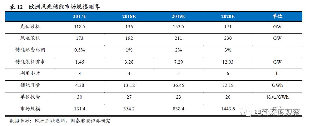 風(fēng)電裝機分別達到171GW、230GW,我們假設(shè)2020年歐洲光伏風(fēng)電儲能配套比例達到3%,利用小時上升到6小時,則對應(yīng)72GWh的儲能容量,假設(shè)儲能系統(tǒng)單位投資下降到20億元/GWh(鉛碳電池0.5元/kwh,4000次循環(huán)),則對應(yīng)1444億元的市場規(guī)模。