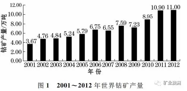 近年來(lái),世界鈷礦產(chǎn)量呈明顯的上升趨勢(shì),從2001年的3.67萬(wàn)噸增長(zhǎng)到2012年的11萬(wàn)噸。盡管2008年受到全球金融危機(jī)的影響,2009年產(chǎn)量有所下降,但隨后的經(jīng)濟(jì)逐漸恢復(fù),使得產(chǎn)量進(jìn)一步提高。特別是在2010年和2011年分別增長(zhǎng)了23.8%和21.8%,由此可見(jiàn),鈷產(chǎn)業(yè)正在快速發(fā)展(見(jiàn)圖1)。