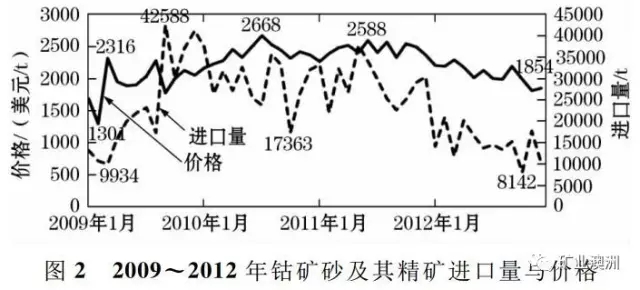 近4年來(lái),鈷礦砂及其精礦進(jìn)口量整體震蕩下滑,在2009年9月達(dá)到高峰值42,588噸,隨后的進(jìn)口量震蕩降低。其價(jià)格整體來(lái)看呈較平穩(wěn)的走勢(shì),2012年前價(jià)格基本在2000~2500美元/噸,2012年后價(jià)格持續(xù)下降,到年底平均價(jià)格已降到1,854美元/噸(見(jiàn)圖2)。