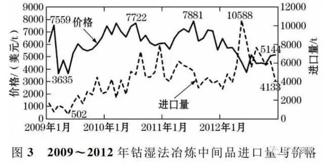 隨著經(jīng)濟(jì)的快速發(fā)展,中國(guó)對(duì)鈷資源的需求量在逐漸增加,進(jìn)口量保持相對(duì)穩(wěn)定。這不僅是因?yàn)橹袊?guó)國(guó)內(nèi)鈷產(chǎn)品的大量生產(chǎn),緩解了中國(guó)進(jìn)口鈷產(chǎn)品的壓力;還因?yàn)橹袊?guó)堅(jiān)持國(guó)外進(jìn)口與國(guó)內(nèi)生產(chǎn)并行的道路,極好地降低了他國(guó)對(duì)鈷價(jià)格壟斷的風(fēng)險(xiǎn)。同時(shí),部分鈷產(chǎn)品的進(jìn)口量與價(jià)格的反比例關(guān)系顯現(xiàn)了中國(guó)良好的進(jìn)口策略。即每當(dāng)價(jià)格升高時(shí)進(jìn)口額降低,當(dāng)價(jià)格降低時(shí)進(jìn)口額猛增,在圖中顯示出上下呼應(yīng)的三角形的形狀。這樣的進(jìn)口策略極好地平抑了價(jià)格,降低了對(duì)中國(guó)進(jìn)口的不利影響。