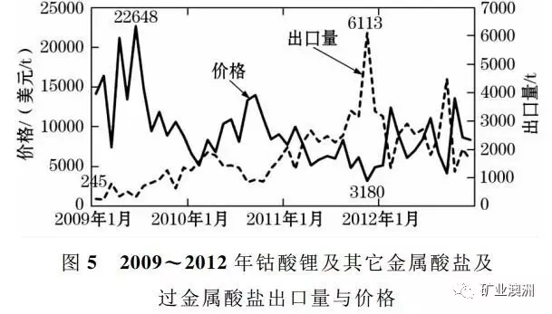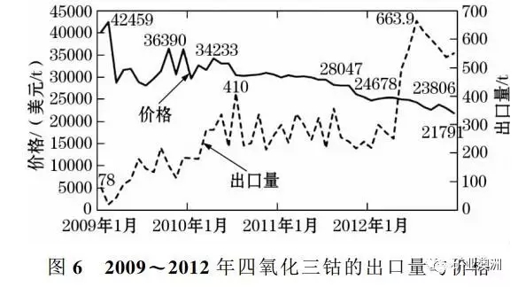 出口的鈷產(chǎn)品主要有四氧化三鈷、鈷酸鋰和草酸鈷等。2012年四氧化三鈷產(chǎn)品總共出口5,646噸,鈷酸鋰及其它金屬酸鹽及過(guò)金屬酸鹽產(chǎn)品一共出口28,682噸,鈷大于等于99.5%的超細(xì)鈷粉、鈷锍、未鍛軋鈷、粉末等鈷產(chǎn)品一共出口3,789噸。