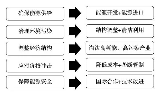 能源革命的目標應該由確保能源供給、治理環(huán)境污染、調整經濟結構、應對價格沖擊、保障能源安全五個維度構成。
