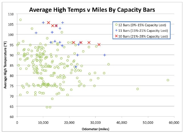 美國亞利桑那州的日產(chǎn)Leaf車主也證實了PIA的調(diào)查結(jié)果——當(dāng)周圍環(huán)境的溫度為(華氏)95度或更高時,Leaf電池組的可用容量就損耗得十分嚴重(見下圖),大部分出現(xiàn)了15%-21%的電池容量損耗,更有的嚴重的甚至下降21%-28%。