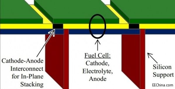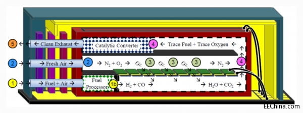 如文末的工作原理圖所示,Nectar燃料電池在工作時,新鮮空氣將進入2號口,成為燃料電池的氧來源??諝夂投⊥榈幕旌衔锉凰腿?號口,然后進入一個微型的反應室進行部分氧化,從而得到氫氣和一氧化碳的混合物。而在區(qū)域3,燃料和氧化劑的反應通過一種特殊轉化層結構,帶來了電力輸出、水和二氧化碳。最后,由于廢氣中仍存有一些燃料物質,所以在被排放至大氣之前,還需要送到區(qū)域4進行催化轉化。