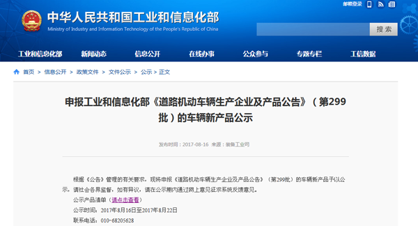 中國儲能網(wǎng)訊:8月16日,國家工信部公示了申報《道路機動車輛生產(chǎn)企業(yè)及產(chǎn)品公告》(第299批)的車輛新產(chǎn)品名單,公示日期為2017年8月16日至2017年8月22日。
