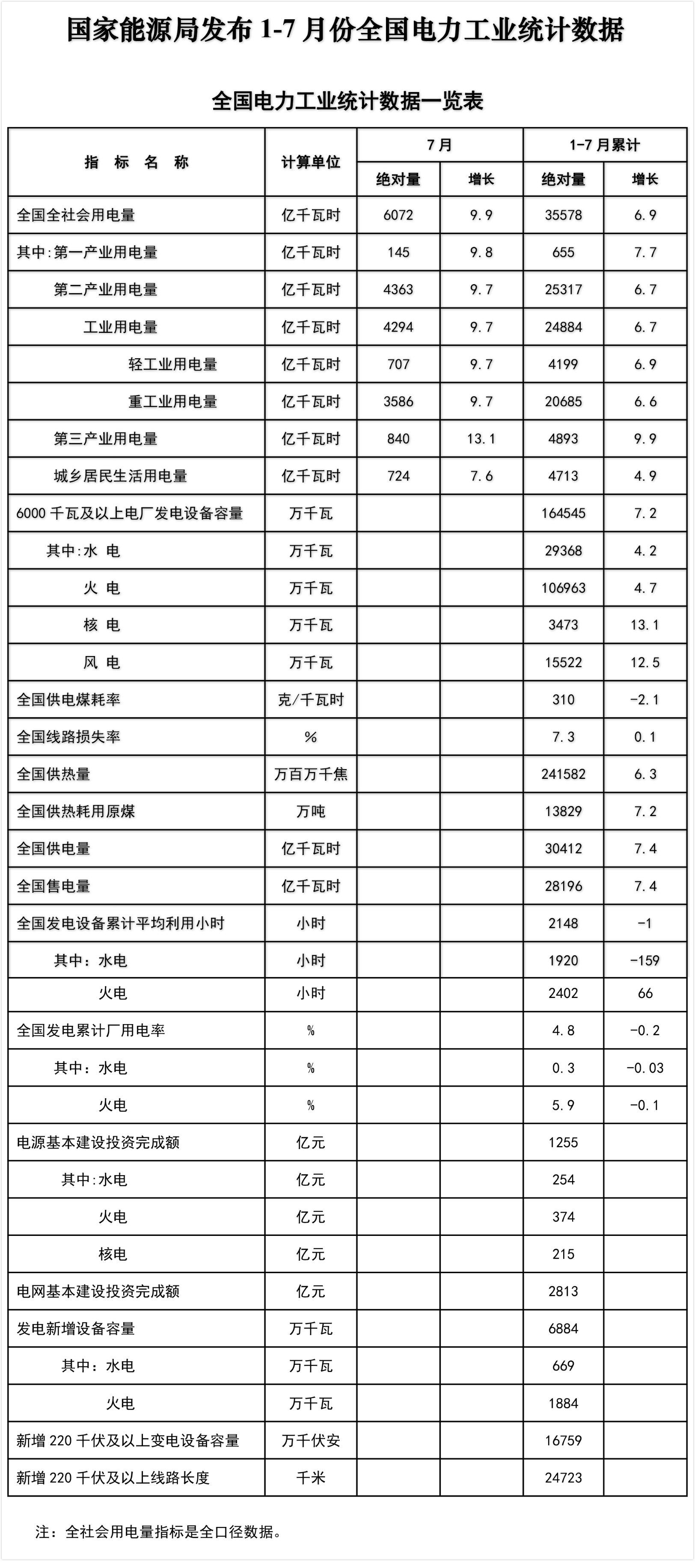 國家能源局發(fā)布1-7月全國電力工業(yè)統(tǒng)計數(shù)據(jù)