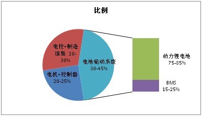 新能源汽車主要由電池驅(qū)動(dòng)系統(tǒng)、電機(jī)系統(tǒng)和電控系統(tǒng)及組裝等部分組成。其中電機(jī)、電控及組裝和傳統(tǒng)汽車基本相同,差價(jià)的原因在于電池驅(qū)動(dòng)系統(tǒng)。從新能源汽車的成本構(gòu)成看,電池驅(qū)動(dòng)系統(tǒng)占據(jù)了新能源汽車成本的30-45%,而動(dòng)力鋰電池又占據(jù)電池驅(qū)動(dòng)系統(tǒng)約75-85%的成本構(gòu)成。