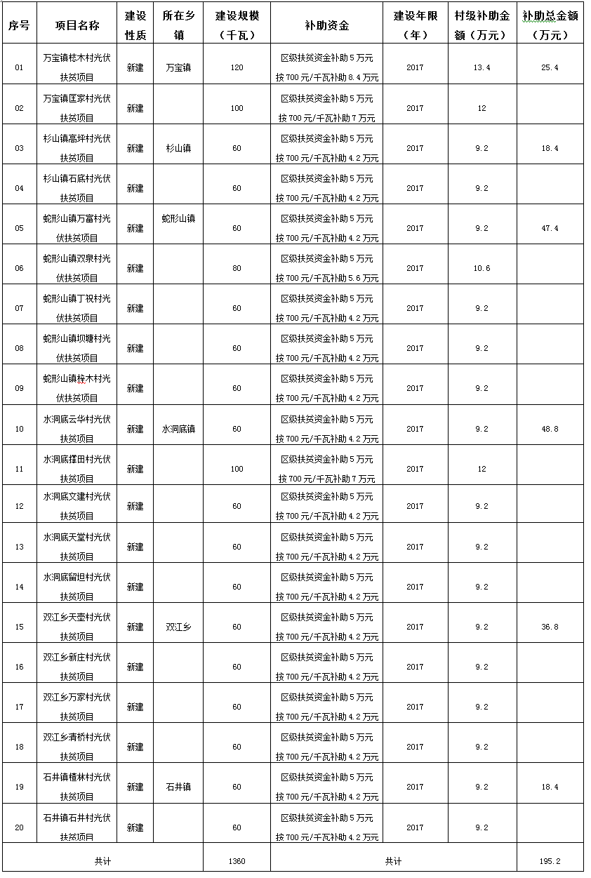 中國儲能網訊:根據(jù)《關于開展光伏產業(yè)扶貧工作的指導意見》(婁星政辦發(fā)〔2017〕7號)和《關于全區(qū)易地扶貧搬遷和省級扶貧村光伏項目工作會議紀要》(婁星府閱〔2017〕10號)精神,對光伏扶貧項目按區(qū)級700元/千瓦的補償資金列入當年財政預算解決,另從區(qū)扶貧辦產業(yè)扶持中安排每個省級貧困村5萬元。根據(jù)項目建設進度,經鄉(xiāng)鎮(zhèn)申請,2017年我區(qū)建設20個省級貧困村1360千瓦撥付財政扶貧資金195.2萬元予以公示,具體明細見附表。