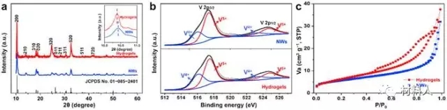 圖二 H2V3O8水凝膠及納米線的XRD, XPS, N2等溫吸脫附曲線