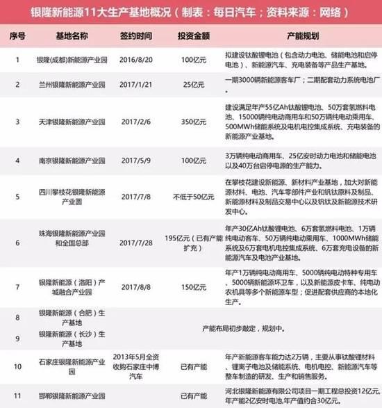 1月21日,蘭州銀隆新能源產(chǎn)業(yè)園項目簽約,前兩期共計劃投資25億元建設(shè)新能源客車生產(chǎn)基地,已于5月開工。5月4日,珠海銀隆全資子公司廣通汽車向江蘇九龍汽車制造有限公司采購26.55億元的電動物流車。同月,總投資100億元的銀隆新能源南京基地在溧水區(qū)開工,建設(shè)周期為2017年至2018年。