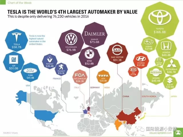 在全球范圍內(nèi)看,特斯拉已經(jīng)進(jìn)入前4強(qiáng),僅次于豐田(1668億美元)、戴姆勒(756億美元)、大眾(769億美元)。