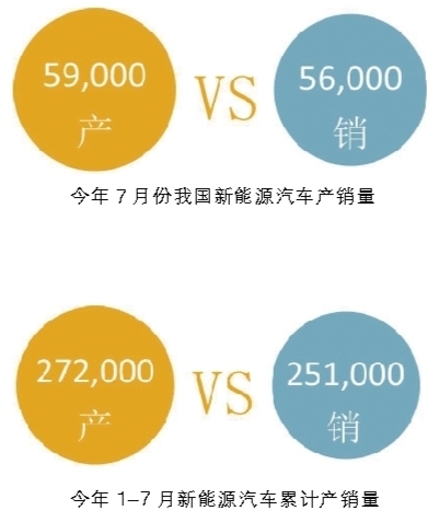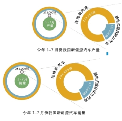 1-7月,我國新能源汽車產(chǎn)銷分別完成27.2萬輛和25.1萬輛,比上年同期分別增長26.2%和21.5%。其中純電動(dòng)汽車產(chǎn)銷分別完成22.3萬輛和20.4萬輛,比上年同期分別增長37.8%和33.6%;插電式混合動(dòng)力汽車產(chǎn)銷分別完成4.9萬輛和4.7萬輛,比上年同期分別下降8.8%和12.8%。