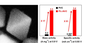 在為PEMFCs合成鉑鎳納米晶體時,使用了一種“神奇溶劑”(本實驗中使用的是二芐醚)。最后,得到了期待的八面晶體,同時,活性表面的表面活性劑數量大幅減少。由UTM Power公司帶隊的邵民華(音)在測量后表示,“這些正八面體表面的質量活性是傳統(tǒng)的鉑碳電化學催化劑的17倍。”