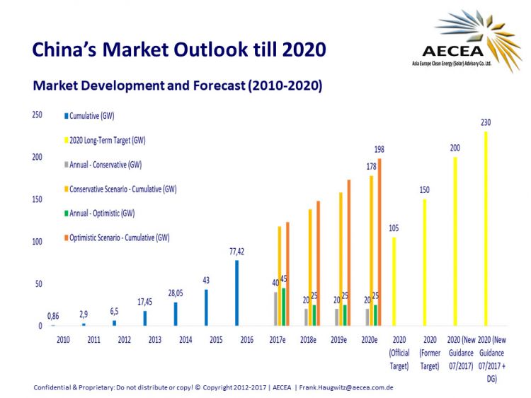隨著7月份部署10.52吉瓦太陽能,AECEA提高了其2017年的預(yù)測(cè),預(yù)計(jì)到年底,中國(guó)可能有望新增40-45吉瓦的太陽能容量。這相當(dāng)于16%同比增長(zhǎng)率,并且有望超過2016年創(chuàng)紀(jì)錄部署容量30%。