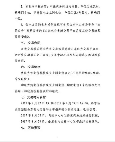 山東電力交易中心8月21日發(fā)布了山東省2017年9月電力直接交易(雙邊協(xié)商)公告,公告中稱,將于8月22日13:30-16:30開(kāi)展山東省2017年9月電力直接交易(雙邊協(xié)商),交易價(jià)格為售電方售電價(jià)格按成交上網(wǎng)電價(jià)確定(不再另計(jì)脫硫、脫硝、除塵電價(jià));購(gòu)電方購(gòu)電價(jià)格由成交上網(wǎng)電價(jià)、輸配電價(jià)(含線損和交叉補(bǔ)貼)和政府性基金及附加組成。