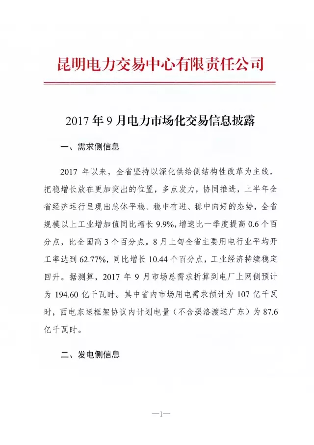8月18日,昆明電力交易中心發(fā)布了2017年9月電力市場(chǎng)化信息披露,據(jù)測(cè)算,2017年9月市場(chǎng)總需求折算到電廠上網(wǎng)側(cè)預(yù)計(jì)為194.60億千瓦時(shí)。其中省內(nèi)市場(chǎng)用電需求預(yù)計(jì)為107億千瓦時(shí),西電東送框架協(xié)議內(nèi)計(jì)劃電量(不含溪洛渡送廣東)為87.6億千瓦時(shí)。