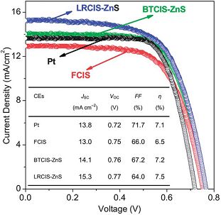 對電極是染料敏化太陽能電池的重要組成部分,目前通常采用貴金屬Pt作為對電極。但是Pt儲量稀少、價格高,極大限制了電池的大規(guī)模工業(yè)生產(chǎn)和商業(yè)化應用。因此尋找價格低、來源豐富的替代材料是亟待解決的關鍵問題之一。該論文以Cu1.94S-ZnS異質結構納米晶為種子,在高溫溶液中引入醋酸銦,最終合成了CuInS2-ZnS異質結構納米材料。通過調節(jié)醋酸銦的加入方式和銦離子的濃度等,可以分別得到火炬狀和長棒狀的CuInS2-ZnS異質結。以其為對電極的染料敏化太陽能電池,光電轉換效率可達7.5%,超過了傳統(tǒng)的Pt電極電池。為高效低成本對電極的研發(fā)開辟了新路徑。