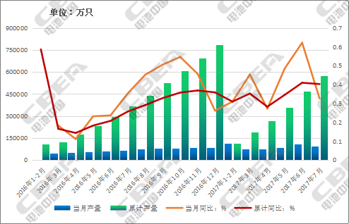 中國儲(chǔ)能網(wǎng)訊:國家統(tǒng)計(jì)局最新公布的數(shù)據(jù)顯示,2017年7月,全國鋰離子電池當(dāng)月產(chǎn)量為93567.6萬只,同比增長46.18%;1-7月累計(jì)完成總產(chǎn)量為571709.3萬只,同比增長55.99%。