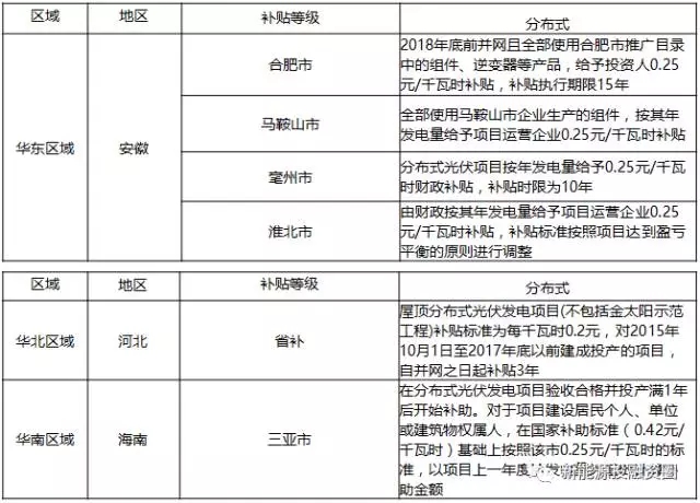 通過查詢?nèi)珖惺∈锌h光伏補(bǔ)貼政策,并加上補(bǔ)貼測(cè)算收益率,可以看出部分省市縣加上補(bǔ)貼可以滿足全額上網(wǎng)類項(xiàng)目投資收益率。加上補(bǔ)貼政策滿足收益率的補(bǔ)貼政策見下表。