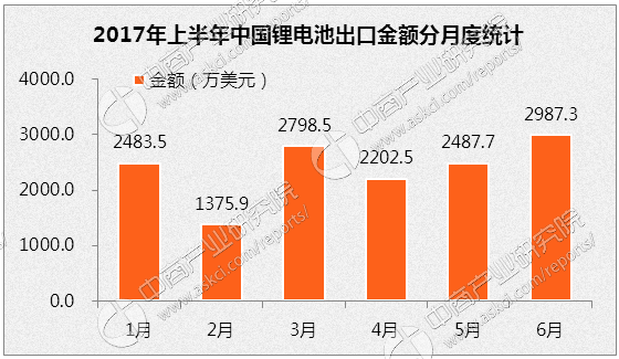 2017年上半年中國鋰電池出口總額為1.43億美元,同比下降25.54%,出口數(shù)量為5.96億個,同比下降44.39%。