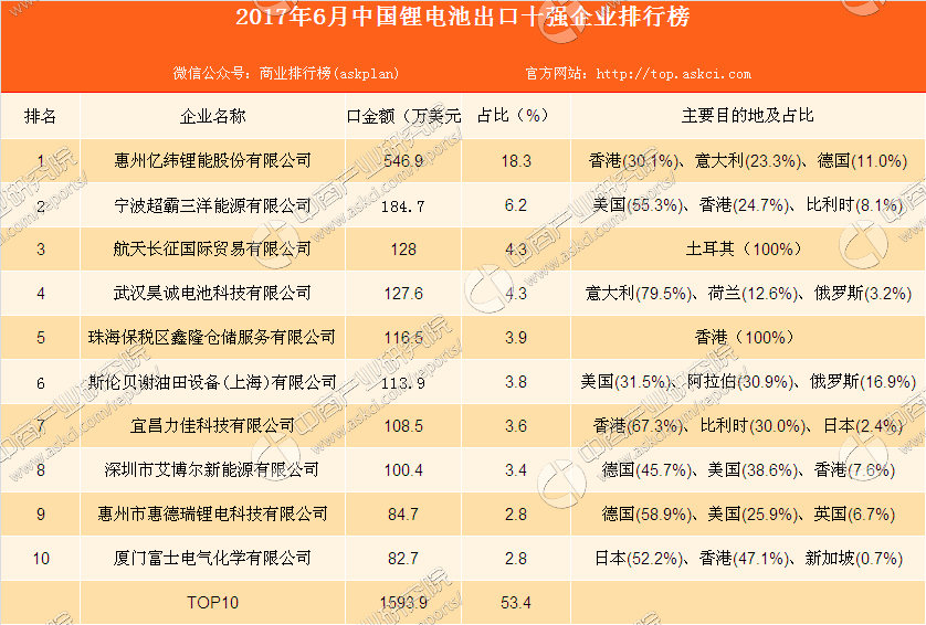 2017年6月中國鋰電池出口企業(yè)約為350家。其中,排在前十企業(yè)合計出口1593.9萬美元,占出口總額的53.36%。2017年6月鋰電池出口前十企業(yè)如下: