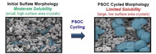 傳統(tǒng)鉛酸電池中的一個核心問題就在于負(fù)極的硫酸鹽化,即在高倍率放電模式下,負(fù)極的海綿狀鉛與HSO4-快速反應(yīng)生成PbSO4,此時因為HSO4-與Pb這一對反應(yīng)物的供應(yīng)失配,導(dǎo)致了PbSO4成核速率太快,這樣就使得生成的PbSO4(本質(zhì)是絕緣的)“糊”在了負(fù)極表面,或者是生成了極大的顆粒;而不是按我們需要的在負(fù)極板內(nèi)部均勻的生成,或者是在表面只是生成細(xì)小均勻容易還原的絨狀PbSO4。