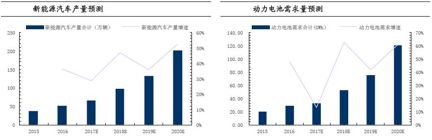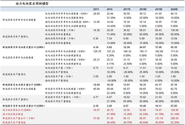 一般而言整車企業(yè)銷售的某款車型在未進入補貼目錄時無法完全定價,尤其是2016年補貼目錄全部重新調(diào)整,因此我們在預測銷量增速時重點參考了2017年各車型進入補貼目錄的進度,其中客車環(huán)節(jié)下滑顯著,而專用車環(huán)節(jié)車型數(shù)量顯著增加。此外,我們也基于2017年達到70萬年銷量與2020年達到200萬年銷量的政策指引,因此我們假設純電動客車今年下滑20%,插電混動客車下滑30%,純電動專用車增長65%,純電動乘用車增長50%,插電乘用車增長20%。此外,由于2018年補貼不退坡,同時產(chǎn)業(yè)鏈第一次大幅降低成本到位,而17年基數(shù)相對低,預計2018年增速有所上升;2019年補貼再次退坡,并且18年提前透支部分消費,19年產(chǎn)銷增速同比18年略微放緩,而2020年補貼不退坡,也是新能源銷量目標政策沖刺最后一年,我們預計產(chǎn)銷增速有望提速。