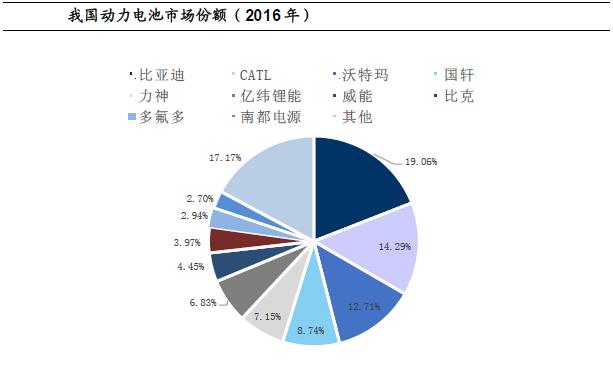 動力電池產(chǎn)能主要集中在中日韓三國,行業(yè)巨頭主要包括韓國的松下、三星、LG化學以及日本的ASEC、三洋電氣、日本湯淺以及SK集團等。國內(nèi)層面,2016年全國動力電池出貨量達到30.5GWh,比亞迪屬于行業(yè)龍頭,全國市占率達到19.06%,其次為CATL與沃特瑪,市場份額分別為14.29%與12.71%。我們認為目前動力電池行業(yè)集中度相對較高,CR10達到82.83%,CR4達到54.8%,雖然行業(yè)處于急速擴產(chǎn)能階段,但劣質(zhì)產(chǎn)能較多,優(yōu)質(zhì)產(chǎn)能仍然欠缺,而優(yōu)質(zhì)產(chǎn)能主要集中在排名在前5-6家的企業(yè),后期行業(yè)集中度有望進一步提升,而規(guī)模效應和技術突破也將促進電池成本穩(wěn)步下降。