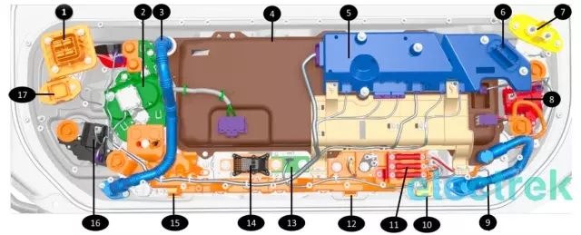 1. 充電口連接器 2. 快充電流接觸器總成 3. 通往 PCS 的冷卻管 4. 功率轉(zhuǎn)換器(PCS)5. 高壓控制器 6. 低壓連接器 7.PCS 的 12V 輸出口 8. 正極高壓電開關(guān) 9. 通往 PCS 的冷卻管 10. 通往乘客艙取暖器、空調(diào)壓縮機的高壓電連接器 11. 乘客艙取暖器、空調(diào)壓縮機和 PCS 直流輸出保險 12. 后軸電機高壓電連接器 13. 高壓電熱熔斷器 14. 未注明 15. 前軸電機高壓電連接器 16. 負極高壓電開關(guān) 17. 三相交流電連接器