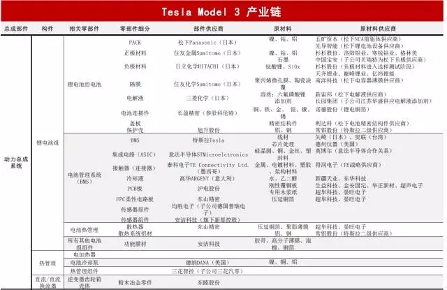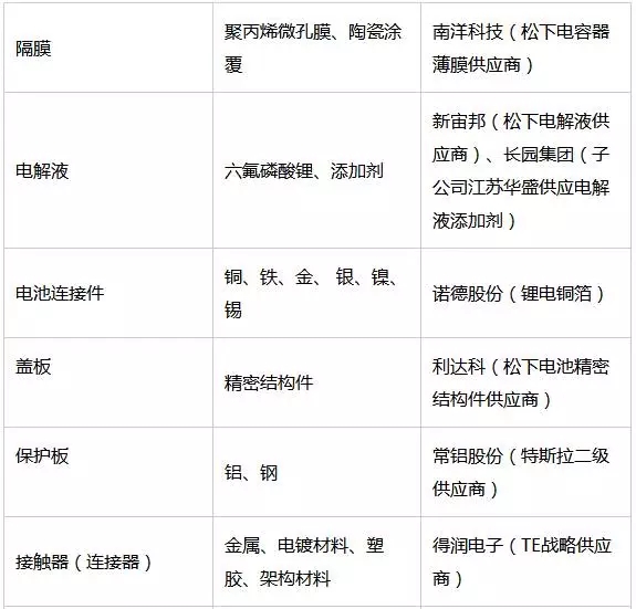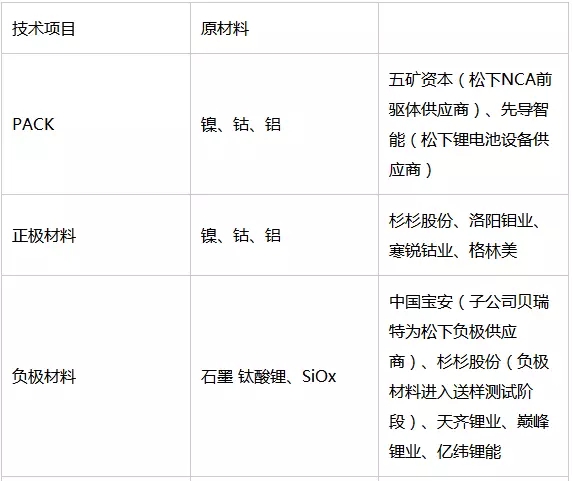 鋰電池組電池PACK也就是鋰電池制造商為日本松下Panasonic公司,其中,五礦資本為松下提供前驅(qū)體,而先導(dǎo)智能為松下提供鋰電池制造設(shè)備;松下產(chǎn)電池正極材料供應(yīng)商為住友金屬Sumitomo,而鎳、鈷、鋁等原材料供應(yīng)商則是來(lái)自中國(guó)的杉杉股份、洛陽(yáng)鉬業(yè)、寒銳鈷業(yè)和格林美三家企業(yè);負(fù)極材料的供應(yīng)商為日本日立化學(xué)HITACHI,石墨來(lái)自于中國(guó)寶安下屬子公司貝特瑞,鈦酸鋰、SiOx 則來(lái)自天齊鋰業(yè)、巔峰鋰業(yè)、億緯鋰能,杉杉股份負(fù)極材料進(jìn)入送樣測(cè)試階段;隔膜來(lái)自日本住友化學(xué)Sumitomo,原材料聚丙烯微孔膜、陶瓷涂覆供應(yīng)商是中國(guó)南洋科技,這家公司同時(shí)也是松下電容器薄膜供應(yīng)商;電解液是日本三菱化學(xué)生產(chǎn),其溶質(zhì)六氟磷酸鋰來(lái)自中國(guó)的新宙邦,它同時(shí)也是松下電解液的供應(yīng)商,添加劑來(lái)自于長(zhǎng)園集團(tuán)子公司江蘇華盛;電池連接件由中國(guó)參股科倫特的長(zhǎng)盈精密公司提供;蓋板、保護(hù)殼由中國(guó)旭升股份提供,而其背后精密結(jié)構(gòu)件由松下電池精密結(jié)構(gòu)件供應(yīng)商利達(dá)科提供,鋁、鋼由常鋁股份提供。