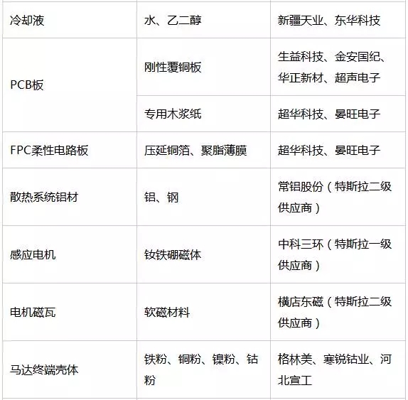 在電池管理系統(tǒng)(BMS)中,特斯拉以其獨(dú)有的BMS核心技術(shù),來(lái)解決電池管理系統(tǒng)。集成電路(ASIC),由意法半導(dǎo)體STMicroelctronics公司提供,其原材料硅晶圓、銅、金絲、塑封料,由中國(guó)意法半導(dǎo)體合作供應(yīng)商英博爾供應(yīng);接觸器(連接器)由墨西哥泰科電子TE Connectivity Ltd.公司提供,原材料金屬、電鍍材料、塑膠、架構(gòu)材料來(lái)自于中國(guó)E戰(zhàn)略供應(yīng)商得潤(rùn)電子;冷卻液來(lái)自于意大利高華ARGENT公司,原材料水、乙二醇,由中國(guó)新疆天業(yè)、東華科技兩家公司提供;PCB板直接來(lái)自于中國(guó)公司滬電股份,原材料剛性覆銅板由生益科技、金安國(guó)紀(jì)、華正新材、超聲電子提供,專用木漿紙由超華科技、晏旺電子提供;FPC柔性電路板來(lái)自于中國(guó)企業(yè)東山精密,原材料壓延銅箔由超華科技、晏旺電子提供;傳感器原件有中國(guó)公司均勝電子下屬子公司德國(guó)普瑞電子提供,傳感器組件由中國(guó)公司安潔科技旗下新星控股公司供應(yīng)。