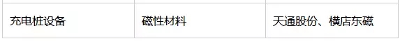 在超級(jí)充電樁中,充電樁運(yùn)營(yíng)特斯拉選擇了中國(guó)上海普天公司;充電網(wǎng)絡(luò)建設(shè)合作特斯拉找到了中國(guó)聯(lián)通和眾業(yè)達(dá);在充電樁設(shè)備提供商中,萬(wàn)馬股份、國(guó)電南自、易事特、特銳德、科陸電子、科士達(dá)、中恒電氣、奧特迅等公司出現(xiàn)在名單中,而原材料磁性材料生產(chǎn)商天通股份、橫店?yáng)|磁也間接進(jìn)入到供應(yīng)商的名單中。