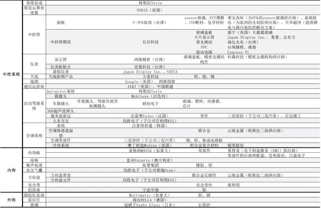 特斯拉電動(dòng)車涉及供應(yīng)商分為動(dòng)力總成系統(tǒng)、電驅(qū)系統(tǒng)、充電、底盤、車身、其他構(gòu)件、中控系統(tǒng)、內(nèi)飾和外飾九個(gè)部分,涉及直接、間接供應(yīng)商一百三十余家,而中國(guó)企業(yè)的身影就占去了一半。